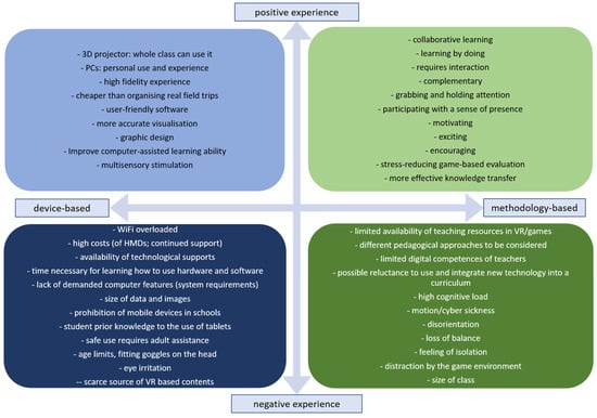 The great variety of research methods also reveals the differences between the availability and accessibility of the hardware and software and also shows dependence on the location as well as the social and economic characteristics of the sample areas. For example, in a research conducted in a public, rural school district with a lower-middle-class community and 63% of the students receiving subsidized lunch based on their family income in Northeast Mississippi (USA), the author found the availability of technological supports such as VR devices and wireless Internet as the strongest limitations to implementing VR in classrooms []. Researchers in Taiwan listed the proper quality of mobile devices as a limitation, highlighting that the fine game scenes and pictures burdened the memory and rapidly consumed the battery life of mobile phones []. The authors of a study conducted in a private K-8 elementary school embedded in a state university in Central Turkey, where the social and economic status of the participating students’ families was above average, also encountered technical-related problems with freezing down computers but support was accessible throughout the research []. The lack of demanded computer features or system requirements is also discussed in a literature review on the use of VR systems and devices in education [].