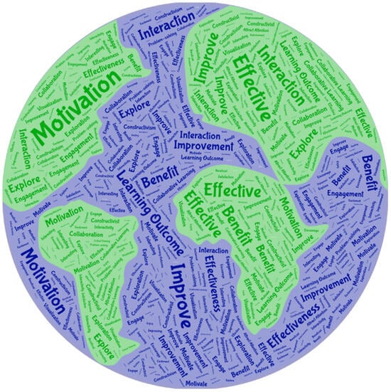 In our discussion of the content and contextual scopes, we concentrated on the comparative analysis of the objectives set by the authors in their work, the demographic characteristics, the applied VR technology (hardware and software), the advantages and disadvantages associated with VR (with special attention to its use in education), and the conclusions drawn by the reviewed authors. WordArt was used to draw the word cloud and analyze the mentioned positive impacts of VR in education.