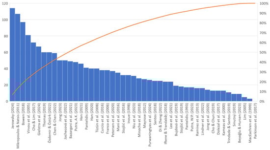 The number of literature items by reviewed works that are included in the bibliography of at least two reviewed works (bibliographic coupling) (red dotted line marks the average number of literature items) (N = 371) [,,,,,,,,,,,,,,,,,,,,,,,,,,,,,,,,,,,,,,,,,,,,,].