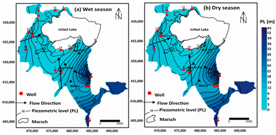 Piezometric maps of Mateur plain: (a) wet season; (b) dry season. The piezometric levels are higher during the wet season compared to the dry season.