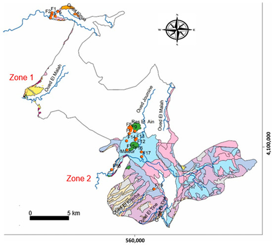 Based on the lithological columns, we can conclude that the Ras El Ain (boreholes F7, F10, and F11) represents a reservoir with a thickness of 20–55 m, while the plain of Oued El Tine (boreholes F12 and F14) contains a multi-layer aquifer with several reservoirs with a thickness of 10 to 20 m.