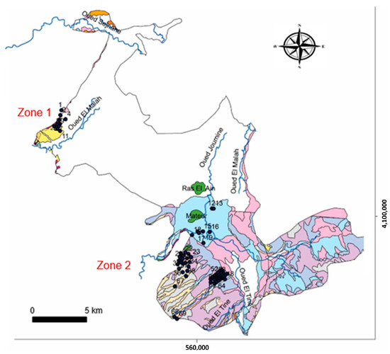 The Mateur plain is characterized by lithostratigraphic units ranging in age from the Triassic to the Quaternary (Figure 2). The carbonate formations that define the Tertiary deposits of the Ichkeul Mountains make up the majority of the stratigraphic succession. In the Mateur plain, only the three Campanian hills of Sidi Mbarek, Mateur, and Ras El Ain contain outcrops older than the Quaternary period [15].