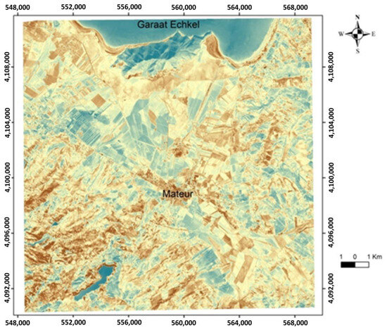 The final phase involved processing the satellite image to support the VES findings. To extract the surface lineaments, which may correspond to tectonic features influencing the aquifer structure, methods such as principal component analysis (PCA), color composition (Figure 7), and directional filtering were employed. Directional filtering, in particular, is an image-processing technique that enhances linear features in a specific direction while suppressing those in other directions. This is achieved by applying filters that are sensitive to edges or contrasts in a given orientation. A set of convolution kernels (small matrices) is designed to enhance features in specific orientations (e.g., 0°, 45°, 60°, and 90°). Common directional filters include Sobel, Prewitt, and Kirsch filters [45,46,47,48,49].