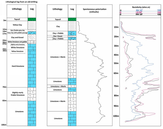 The examination of the available lithological column for the old drilling F7 (illustrated at the left of Figure 8, selected as an example), represents three reservoirs. The first one extends from 14 to 17 m, corresponding to pebbles and clay soils. The second spans from 27 to 70 m, and the third, which ranges from 83 to 106 m, is composed of limestone soils. However, the lithological log illustrated at the right of the figure, obtained from updated diagraphic recordings for both spontaneous polarization (SP) and resistivity, indicates five reservoirs: [14 to 18 m] and [19 to 23 m], corresponding to resistivity values between 50 and 90 Ohm·m, assigned to pebbly and clayey lithology; [65 to 70 m] and [72 to 76 m], with a resistivity values ranging from 40 to 98 Ohm·m; and the last one [94 to 106 m], consisting of limestone lithology. In order to achieve greater accuracy, this study will rely on the interpretation of the well log. Three types of resistivity were measured: shallow resistivity (short normal, SN), which represents the resistivity of the invaded zone; deep resistivity (long normal, LN), which represents the resistivity of the uninvaded zone; and inversed resistivity (INV), which is compared with a reference point at the surface. The numbers in the heading indicate the diameter of the penetrated zone measured, in inches.