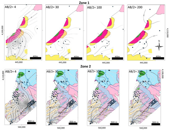 Apparent resistivity maps for zones 1 (upper panel) and 2 (lower panel) are presented for different depth slices corresponding to AB/2 spacings of 4 m, 30 m, 100 m, and 200 m.