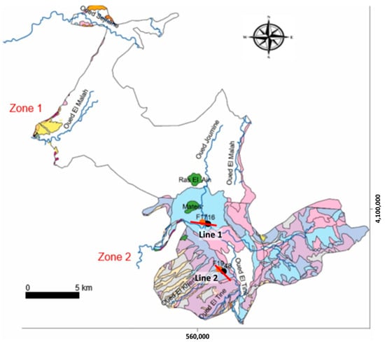 - Guellala, R.; Amiri, A.; Ben Lasmar, R.; Hamed Ferjeni, A.; Jaouadi, I.; Inoubli, M.H.; Ben Youssef, M. Geophysical contributions to hydrogeological study in the Chemtou-Sidi Miskine Agricultural Sector (Northwestern Tunisia). Nat. Resour. Res. 2017, 27, 41–50. [Google Scholar] [CrossRef]