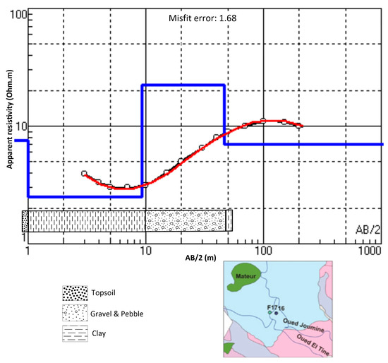 VES is the most popular electrical technique for measuring resistivity to extract information about the subsurface, particularly for hydrogeological purposes [27,29]. Resistivity, denoted as and measured in Ohm·m, is a material’s ability to resist electric current. It varies greatly from one material to another since it is affected by a variety of parameters, including rock type, porosity, pores conductivity, water saturation, water salinity, and metallic content [29,30,31]. For instance, pyrrhotite (FeS) is constantly very conductive and has a resistivity of about 10−5 Ohm·m, whereas igneous and metamorphic rocks often have high resistivity values (103 to 106 Ohm·m). Groundwater, which serves as an electrolyte, significantly influences the electrical conductivity of sedimentary rocks like the Mateur Quaternary deposits by reducing the resistivity values [32]. The concentration and mobility of ions have an impact on the conductivity of groundwater. Mobility varies from ion to ion and rises with temperature (e.g., H+ has a velocity of 36.2 × 10−8 m/s compared to Na+ of 5.2 × 10−8 m/s) [33].