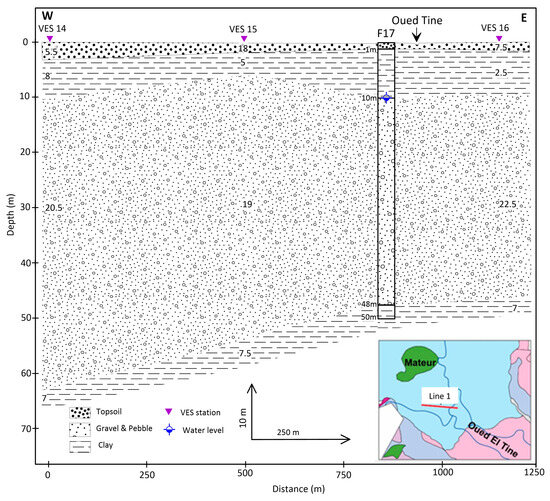 Several geoelectrical cross-sections were established in various directions, and two of them were selected as examples in the present work. Geoelectrical cross-section 1, oriented E–W (Figure 12), runs along Oued El Tine and includes the lithological log of borehole F17, along with three electrical soundings (VESes 14–16). The topsoil has a thickness ranging from 1 to 5 m, with resistivity values between 5.5 and 18 Ohm·m. The second layer, with a thickness of 5 to 9 m, represents clayey soil as inferred from borehole F17, with a resistivity range of 2.5 to 8 Ohm·m. The third layer, extending from 7 m below VES15 to 62 m below VES14, is characterized by pebbly and gravelly lithology, as indicated by borehole F17, and has a resistivity range of 19 to 22.5 Ohm·m, suggesting a good groundwater aquifer. Its thickness increases westward. The fourth layer consists of clay with an average resistivity of around 7 Ohm·m.