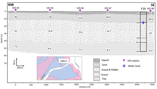 The VES calibration was accomplished by means of two boreholes, F17 and F19, located near VES stations 16 and 48, respectively (Figure 10). A comparison between VES16 and the lithological column of borehole F17 (Figure 11) shows that the clayey soil corresponds to a resistivity value of 2.5 Ohm·m, the sandy clay layer to 7 Ohm·m, and the gravel and pebbles layer to a resistivity value of 22.5 Ohm·m. Similarly, the comparison between VES48 and the lithological column of borehole F19 reveals the following: the topsoil has a resistivity value of 18.4 Ohm·m; the sandy layer has a resistivity value of 30.5 Ohm·m; the gravel, pebbles, and gravelly layers have a resistivity value of 20 Ohm·m; and the clay layer has a resistivity of 6.5 Ohm·m.