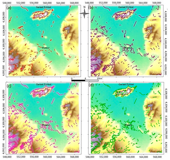 Lineament maps produced by directional filtering with directions of (a) N00, (b) N45, (c) N60 and (d) N90.
