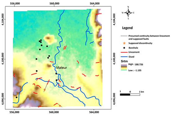 Understanding the key mechanisms governing groundwater chemistry is essential, yet challenging, for sustainable groundwater resource management, particularly in complex geological and hydrogeological settings [12]. The quaternary alluvial aquifer is a vital water resource in the Mateur region in the Bizerte region of Tunisia, sustaining local domestic and agricultural water supply [13,14]. The aim of this study is to characterize the geometry of the Mateur aquifer system through an integrated approach using data from boreholes, geophysical methods, and remote sensing. The study seeks to enhance our understanding of the aquifer system’s structure and validate these insights with a combination of these techniques.