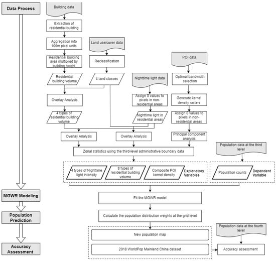 The steps of processing research data, fitting the MGWR model to predict the population at the grid level, and evaluating accuracy are shown in Figure 1.