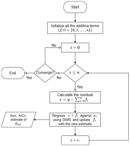 Each coefficient of the MGWR model has a different bandwidth, while all coefficients of the GWR model have the same bandwidth. This is the main difference between MGWR and GWR models. The GWR model uses weighted least squares to obtain the coefficients. The coefficients and bandwidths of the MGWR model are obtained through a method known as the Back-Fitting Algorithm (BFA), which was initially used to estimate parameters for Generalized Additive Models (GAM) [51]. Following the logic of GAM, the term is defined as the jth additive term , leading to the GAM-style MGWR