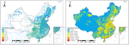 (a) Population distribution weight map of mainland China. (b) Third-level resident population count map of mainland China.
