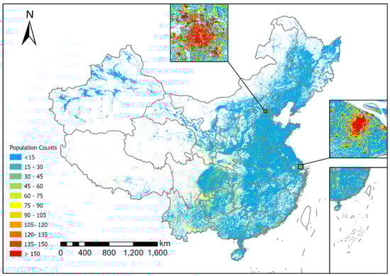 We used the MGWR model with building height and POI data added to disaggregate the Chinese population data. The standard experimental group’s 13 explanatory variable layers (listed in Table 2) were used by the MGWR model to predict population distribution weights on 100 m grid cells. Specifically, the regression coefficients from the MGWR model were first converted to raster layers at 100 m spatial resolution. Then, raster computations were performed with the explanatory variable layers in the order of the model to obtain the population distribution weights layer. This follows the assumption of scale invariance of the relationship between population and explanatory variables. Figure 3 displays the population distribution weights on 100 m grids and mainland China’s third-level resident population counts. Finally, following Formula (5), all third-level population counts were disaggregated into 100 m grid cells, resulting in the population distribution map of mainland China with a spatial resolution of 100 m, as shown in Figure 4.