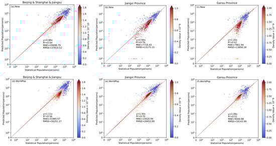 Figure 5 displays the RMSE and MAE indicators for the new gridded population map and WorldPop. Group 1’s MAE values for the new gridded population map and WorldPop are 20,698.79 and 31,985.07, respectively. For Group 2, the corresponding MAE values are 7716.43 and 15,620.94, while in Group 3, they are 7861.94 and 9049.98. Regarding the RMSE, Group 1 shows values of 37,914.52 for the new gridded population map and 56,201.27 for WorldPop. For Group 2, the RMSE values are 13,175.15 and 26,652.89; for Group 3, they are 13,856.28 and 18,143.99. Compared to WorldPop, the MAE values of the new gridded population map were reduced by 35.28%, 50.60%, and 13.13% for the three groups, respectively. The RMSE values of each group were reduced by 32.54%, 50.57%, and 23.63%, respectively. For the new gridded population map, the R2 for the three groups are 0.64, 0.78, and 0.67, respectively; for WorldPop, they are 0.56, 0.70, and 0.51, respectively. Therefore, the new gridded population map has higher overall accuracy than WorldPop.