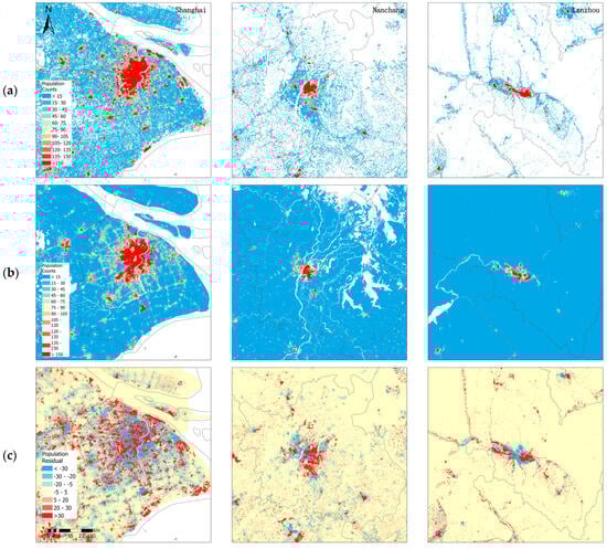 The new population gridded map and WorldPop in three cities and their differences. Row (a) displays the new gridded population map, row (b) displays WorldPop, and row (c) displays the difference between the new gridded population map and WorldPop.