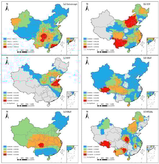 - Intercept, UIV, NTLI, IReV, UReV, IRuV, NTLRu, IUV, and POI have bandwidths ranging from 11 to 29, exhibiting micro-scale features in the model. The spatial scale is close to the level of prefecture-level cities in mainland China. On the one hand, this indicates that they exhibit considerable spatial nonstationarity in the model. Once the spatial range is exceeded, the coefficients will change dramatically. On the other hand, it also proves that the population is sensitive to these variables in this modeling approach.