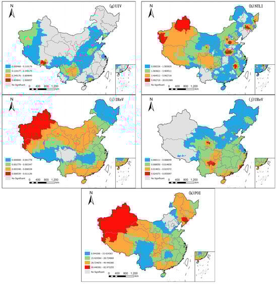 In total, 2613 sample units show significant POI coefficients, representing 91.68% of the total samples. From Figure 7k, the areas with non-significant POI coefficients are mainly concentrated in Beijing–Tianjin–Hebei and parts of Inner Mongolia. The high values of the significant POI coefficients are mainly in most of Northwest China, most of Northeast China, parts of Central China, Tibet, most of Guangdong, and most of Guangxi. Surprisingly, the POI regression coefficients are higher in many economically underdeveloped regions (e.g., Tibet, Northwest China, and Northeast China) than in economically developed regions (e.g., southeastern coastal region). This may be due to differences in the spatial equality of economic development. Compared to economically developed regions, economically underdeveloped regions tend to have higher spatial inequality in the level of economic development, and thus, POI, which represents economic dynamism, is more attractive to people, i.e., the population is more dependent on POI. From Table 7, the POI coefficients for the whole study area range from −8.8 to 83, with a mean value of 24.6 and a standard error of 15.5, which represents an average impact of 2460 people per 100 values of composite POI kernel density on the population of the third-level administrative units in the whole study area, with relatively significant differences in the impact of composite POI kernel density on the population in different regions.