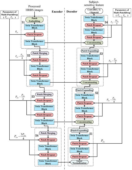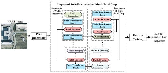 In this paper, an improved Swin-Unet algorithm based on the Multi-Patchdrop mechanism is proposed to implement a subject-sensitive hashing algorithm for HRRS images. In this improved Swin-Unet, each Swin Transformer block except the first one is preceded by a Patch Dropout layer to randomly drop a subset of patches, and the probability of dropping patches is different for each Patch Dropout layer, which is determined by the Multi-Patchdrop. Through experiments and discussions, the following conclusions can be drawn: