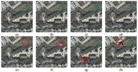 The original HRRS image shown in Figure 4a is stored in TIFF format. Figure 4b–d shows the results of 95% JPEG compression, conversion to a PNG format, and invisible watermark embedding of the original image. Visually, Figure 4b–d is almost indistinguishable from the original HRRS images, but they have changed dramatically at the binary level. Figure 4e–h is a set of operations to change the content of the HRRS image in the following order: subject-unrelated tampering, subject-related tampering 1 (add a building), subject-related tampering 2 (delete a building), and random smearing tampering.