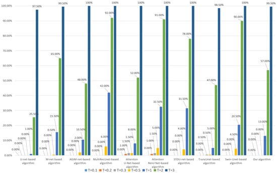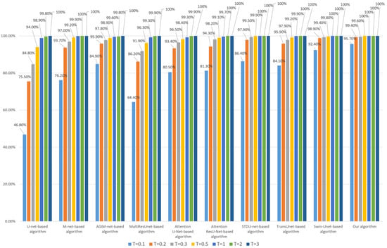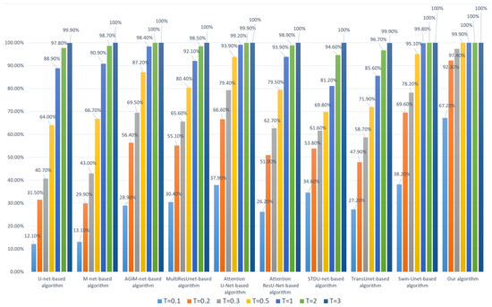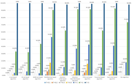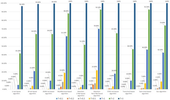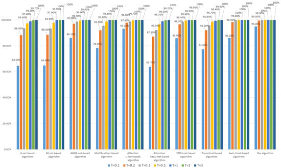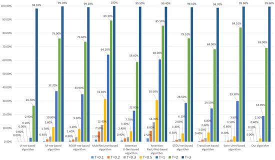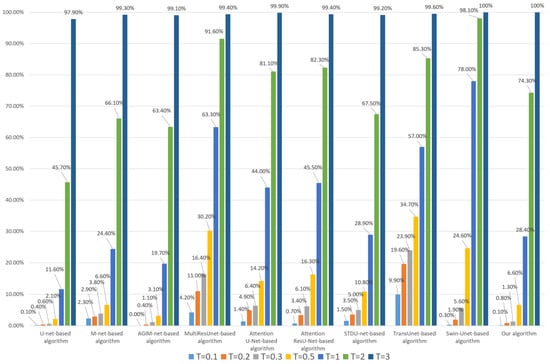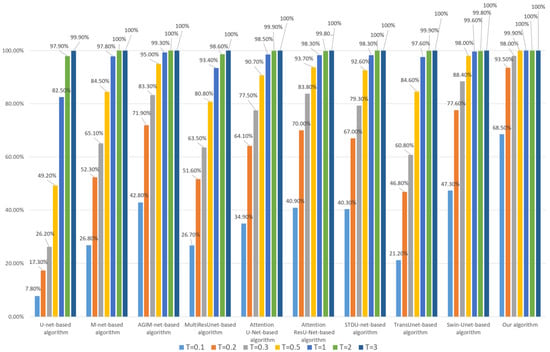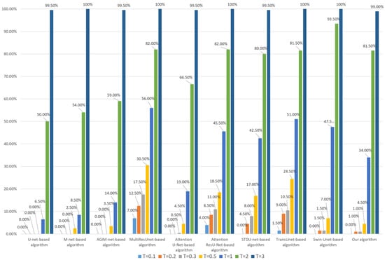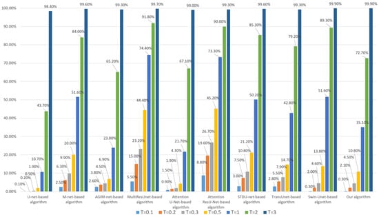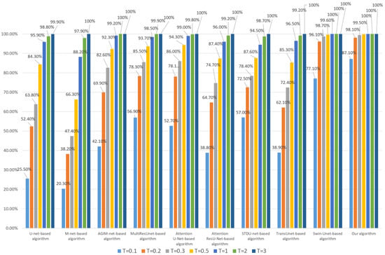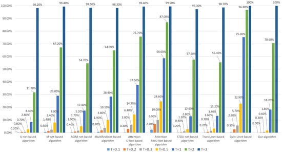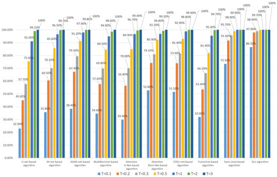 As can be seen from Figure 9 and Figure 10, our algorithm has the best robustness to subtle manipulation among these algorithms. In the case of a low threshold T, not only are the algorithms based on CNN models such as U-Net, M-Net, and MultiResUnet not ideal, but also the algorithms based on the attention mechanism (including AGIM-net and Attention U-Net) are not as robust as our algorithm and Swin-Unet-based algorithm.