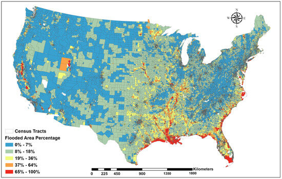 FEMA’s National Flood Insurance Program (NFIP) plays a pivotal role in flood risk management by creating Flood Insurance Rate Maps (FIRMs) that delineate the Special Flood Hazard Area (SFHA), highlighting the 100-year floodplain with a 1% annual chance of flooding. However, due to economic, political, and geographical factors, a significant portion of the CONUS—mainly rural and less developed regions—remains unmapped, posing a substantial gap in flood risk management and land use planning [28]. A Random Forest (RF) classification technique was used to address this gap, and a 100-year, 30-meter-resolution flood inundation layer was developed for the entire CONUS. It was achieved using FEMA SFHA maps and ten predictive variables for each Hydrologic Unit Code level four (HUC-4) region [28]. The floodplain data were sourced from the US Environmental Protection Agency’s (EPA) EnviroAtlas website “https://www.epa.gov/enviroatlas/enviroatlas-interactive-map (accessed on 15 September 2023)”. The ArcGIS Pro statistics tool, in conjunction with the flood raster layer, facilitated the calculation of the flooded zone area for each census tract. Figure 1 shows the distribution of flooded zone area percentage of each census tract used in our analysis.