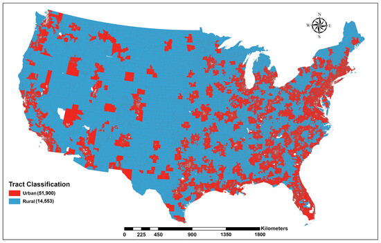 For our analysis, the ten primary RUCA categories, as shown in Table 1, were subdivided into two categories (urban and rural). Among the 66,543 census tracts considered for our analysis, 51,990 are considered urban tracts (metro), and the remaining 14,553 are rural tracts (non-metro). The reclassified census tract distribution is shown in Figure 2.