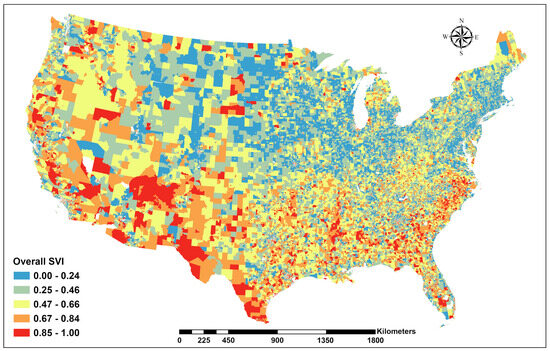 We utilized data from the American Community Survey (ACS) 2016–2020, focusing on 16 social vulnerability factors. These variables encompass socioeconomic status, household composition, racial and ethnic minority status, and housing and transportation access, as listed in Table 2. The data cover 84,122 census tracts across the US, with the dataset available in multiple formats, including CSV and Esri Geodatabase from the CDC/ATSDR SVI database. The Esri Geodatabase was from https://www.atsdr.cdc.gov/placeandhealth/svi/data_documentation_download.html (accessed on 15 September 2023), and only 66,543 tracts were filtered as required for our analysis.