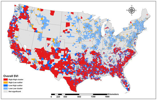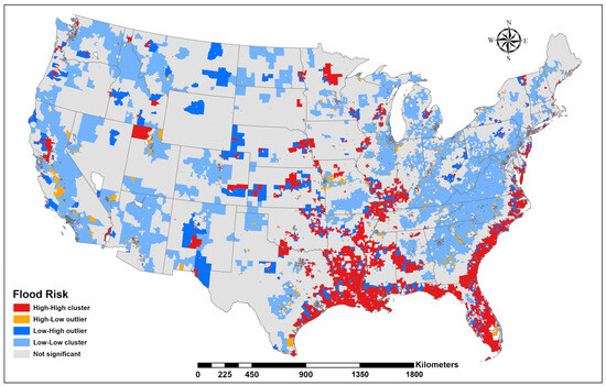 Figure 4 and Figure 5 illustrate the statistically significant (at the 95% confidence interval) hot spots, cold spots, and spatial outliers of flood risk and social vulnerability. Notably, overlaps between the significant clusters of high flood risk and high social vulnerability indicate areas of compounded risk. For instance, significant hot spots of both flood risk and high social vulnerability are found in the southeastern US, particularly along the Gulf Coast and parts of the Mississippi River basin. The LISA analysis for the SVI reveals notable differences between urban and rural areas. High–high clusters, which indicate areas of high social vulnerability surrounded by similarly vulnerable tracts, are predominantly found in urban regions, with 12,416 urban tracts compared to 3752 rural tracts. This pattern highlights significant pockets of social vulnerability within urban centers, particularly in the southeastern US and along the Mississippi River Basin. Conversely, low–low clusters, representing areas of low social vulnerability, are also more common in urban areas (13,547 tracts) than rural areas (1364 tracts), predominantly in the northwestern US.