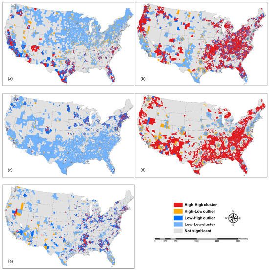 Clusters of hot and cold spots of (a) Socioeconomic Disadvantage, (b) Elderly and Disability, (c) Housing Density and Vehicle Access, (d) Youth and Mobile Housing, and (e) Group Quarters and Unemployment.
