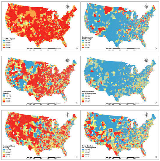(a) R-squared distribution from GWR model and coefficients of (b) Socioeconomic Disadvantage, (c) Elderly and Disability, (d) Housing Density and Vehicle Access, (e) Youth and Mobile Housing, and (f) Group Quarters and Unemployment for the overall dataset.