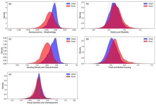 Coefficient distributions of social vulnerability components across urban and rural areas from GWR analysis of overall dataset. (a) Socioeconomic Disadvantage, (b) Elderly and Disability, (c) Housing Density and Vehicle Access, (d) Youth and Mobile Housing, and (e) Group Quarters and Unemployment.