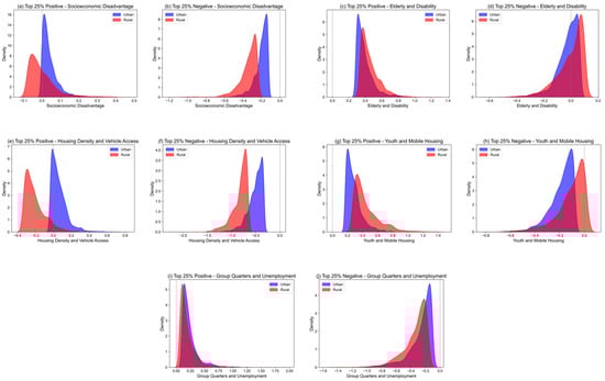 Distribution of top positive and negative coefficient values for social vulnerability components in urban and rural areas. (a,b) Socioeconomic Disadvantage, (c,d) Elderly and Disability, (e,f) Housing Density and Vehicle Access, (g,h) Youth and Mobile Housing, and (i,j) Group Quarters and Unemployment.