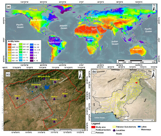 (a) The global aridity map highlights Pakistan’s position within the arid to semi-arid region (Kamerman, 2020). Panels (b,c) display the Islamabad capital city, represented by a red polygon in northeastern Pakistan, using Landsat-8 imagery (RGB; 7, 5, 2), along with its primary water resources and infrastructure.