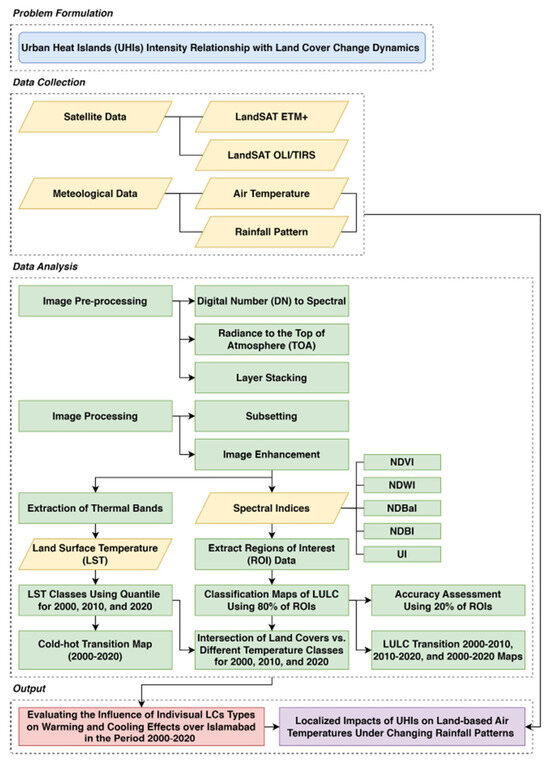While some studies have exclusively focused on the dynamic changes in LULC and their effects on UHIs in Islamabad, this research shed insights on the thermal influence of various LC types on LST-based temperature classes, encompassing both cooling and warming effects, and their impact on local air temperature under anthropic interventions and erratic rainfall patterns. The study integrates Landsat imagery (7 and 8), ground-based meteorological data, and GIS technologies to (1) investigate the spatiotemporal changes in LULC from 2000 to 2020, identifying key driving factors and their influence across different LST ranges and (2) evaluate the contributions of different LC types to warming and cooling effects in the period 2000–2020, along with the resultant impacts on localized air temperature variations under variable precipitation patterns, as derived from ground observations. This research explores the impact of driving forces, such as human activities and population growth, on UHIs and related environmental degradation in Islamabad. The findings aim to improve understanding of how urban planners can mitigate anthropogenic stressors, aiding decision-makers in formulating effective climate adaptation strategies.