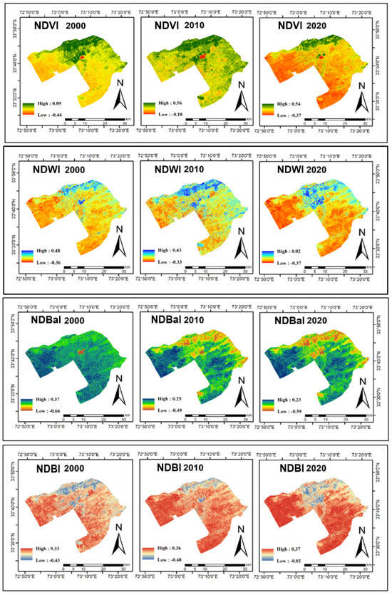 Maps of the spectral indices of Islamabad for the period 2000–2020.