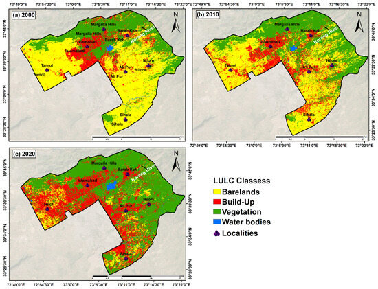 LULC changes in Islamabad city over the studied period: (a) 2000, (b) 2010, and (c) 2020.