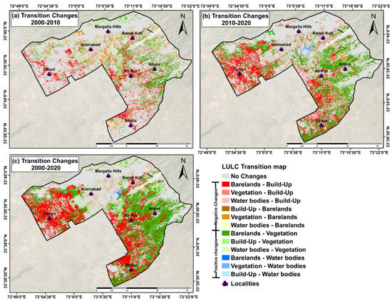 The LULC transition map in Islamabad city for the periods: (a) 2000–2010, (b) 2010–2020, and (c) 2000–2020.