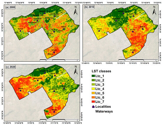 Spatial pattern of temperature classes based on LST ranges in different years: (a) 2000, (b) 2010, and (c) 2020.