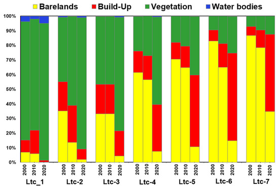 Figure 9 represents the LCI of each LULC class against each temperature class in the entire area from 2000 to 2020. An LCI value of ≥0 indicates that the corresponding LULC class contributes to a temperature increase in the area, whereas an LCI value of <0 suggests that the LULC class contributes to a temperature decrease in the region. In the Ltc_1 class, the LCI for vegetation, water bodies, bare lands, and built-up areas exhibited negative values in 2000 and 2010, initially contributing to cooling. Notably, vegetation demonstrated the least negative LCI among these categories, reaching up to −0.45 for vegetation cover. By 2020, only vegetation and water bodies retained negative LCI values, suggesting their continued positive impact on temperature reduction over time. Between 2000 and 2010, the LCI of vegetation, water bodies, bare lands, and built-up areas showed negative LCI values from the Ltc_2 to Ltc_3 classes. However, these values became positive in Ltc_4, slightly contributing to a temperature increase in the class. The vegetation and built-up areas played a significant role in mitigating heat in the Ltc_2 to Ltc_4 regions. Meanwhile, the LCI for water bodies does not exist from Ltc_2 to Ltc_7 classes. The LCI for bare land and built-up areas is notably higher in the Ltc_5 and Ltc_6 classes compared to the lower temperature classes. Within the Ltc_7 class, bare lands exhibited the most pronounced positive temperature in 2000 and 2010, while built-up areas recorded the greatest positive values in 2020. Overall, the LCI of vegetation and water bodies consistently exert a cooling effect in lower temperature zones (Ltc_1 to Ltc_3), while bare land and built-up areas show a weaker cooling impact during the study period. In higher temperature zones (Ltc_5 to Ltc_7), bare land and built-up areas significantly contribute to regional warming. Over the years, the highest LCI in 2000 was observed for Ltc_1 and Ltc_5 to Ltc_7, with Ltc_4 peaking in 2010 and Ltc_2 and Ltc_3 in 2020.