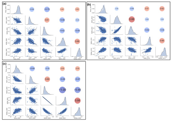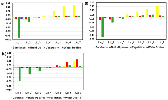 LCI of each LULC in each LST class over the study period: (a) 2000, (b) 2010, and (c) 2020.