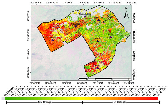 Figure 10 illustrates the WCT map, highlighting spatial changes in regions where LST classes overlap from 2000 to 2020. These overlapping areas are concentrated within 42 adjacent categories, which are evenly distributed between cold-to-hot and hot-to-cold temperature transitions as defined in this study. The spatial distribution of temperature increased over the study period (Figure 10), particularly in newly developed urban areas such as western Tarnol, Islamabad, Barar Koh, Ali Pur, and Sihala districts. Consequently, regions with overlapping cold and hot areas experience a lower warming degree compared to other regions (Figure 6a). This has led to an upgrade in their LST classification by 2020 (Figure 6b). As depicted in Figure 9, the presence of built-up areas and bare land contributes significantly to surface heating. In contrast, the northern regions, characterized by high terrains and lakes, such as Margalla Hills and Rawal Lake, have maintained relatively stable temperature conditions. On the contrary, areas with overlapping hot and cold characteristics exhibited a relatively high warming degree in 2000, particularly in the eastern and middle parts, resulting in a downgrade of their temperature classification (Figure 10).