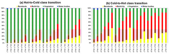 Figure 11 shows the proportion of each land cover type in the overlapping areas of the cold-to-hot and hot-to-cold groups over the studied period. Reasonably, cold-to-hot transitions occur more frequently in the lower temperature range, whereas hot-to-cold transitions are more prevalent in the higher temperature range (Figure 11). In the hot–cold overlap category, the proportion of vegetation was notably higher than that of other LC types during transitions from higher to lower temperature classes except for transitions between Ltc_6 to Ltc_5, Ltc_7 to Ltc_5, and Ltc_7 to Ltc_6 classes (Figure 11a). In the cold–hot overlap category, the proportion of bare land and built-up areas significantly increased as the transitions moved from lower to higher temperature classes (Figure 11b). The proportion of vegetation is greater in the Ltc_2 to Ltc_1 class compared to other transition classes.