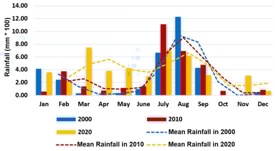 The LST was compared with air temperature data from the PMD in Islamabad for the years 2000, 2010, and 2020 (Figure A1). Meteorological data indicated that the highest average temperatures occurred in May and June in 2000 and 2010, respectively, while July recorded the highest temperatures in 2020. This shift indicates a transition of the hottest months from May and June to an extension into July. Interestingly, the estimated LST values closely aligned with the ground measurements from PMD for 2010 and 2020, ranging from 35 to 39 °C (Figure 12). Figure 12 presents the comparison between LST derived from satellite data and air temperature obtained from ground measurements. The maximum temperature difference between the mean annual land-based air temperature and LST was 11.55 °C in 2000, decreasing to 2.28 °C in 2020, indicating a significant reduction in monthly air temperatures over the observed years. To further explore the reasons behind this decrease in air temperature, monthly rainfall patterns for 2000, 2010, and 2020 were analyzed (Figure 13). The monsoon season in Islamabad typically spans from June to September, with the highest rainfall recorded at the end of June, which was followed by July and August in 2010. In contrast, a more consistent rainfall pattern was observed throughout the year in 2020, with total annual rainfall reaching 1365.47 mm, which was considerably higher than the 982.88 mm recorded in 2000. Notably, August 2000 and March 2020 experienced the highest rainfall in Islamabad.