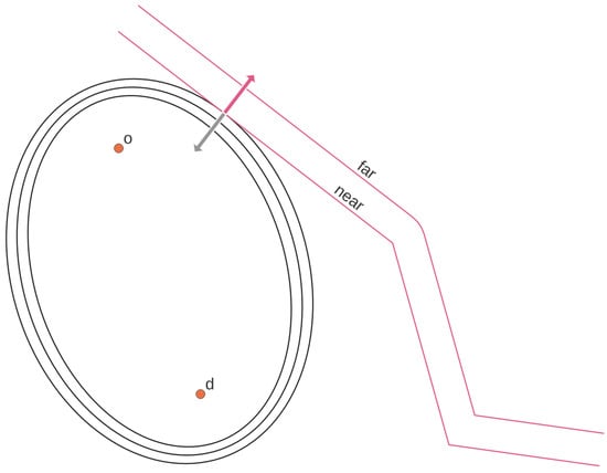 There are two main forces that determine the optimal solution for the location  in the milkmaid problem (and optimization problems in general): (1) the objective function , and (2) the constraint . The objective function can be expressed as . That is, the objective is to minimize the total lengths of the two trips from  to  and  to . As illustrated in Figure 1, the equidistant lines to points  and  (or isochrones of ) are a series of ellipses. The smaller the ellipses, the better the objective value. This is indicated by the gradient vector of the ellipses in the figure (towards the near side).