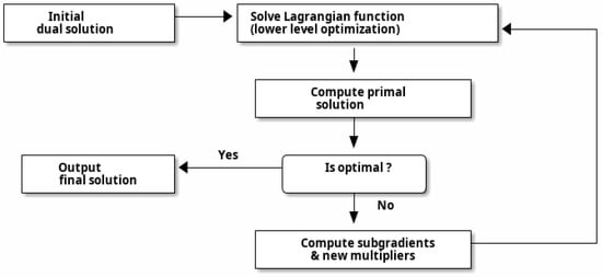 After solving the Lagrangian function, we will allow the multipliers to vary in a higher-level optimization problem (i.e., the Lagrangian dual problem) in search of improved dual solutions. In particular, we will optimize the optimal solution of the lower-level Lagrangian function w.r.t. the multipliers (i.e., the dual variables ) by computing the gradients of the Lagrangian function. Based on these gradients, we can compute a set of new multiplier values (as will be discussed shortly) giving rise to a new iteration of the search. In the flowchart in Figure 2, solving Lagrangian function constitutes the lower-level optimization (optimizing primal variables) and the overall loop structure constitutes the higher-level optimization problem (optimizing the dual variables/multipliers).