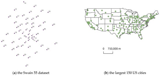For comparison purposes, we also use the US Cities 150 dataset [] in Figure 3b as a second test dataset (called cities150 hereafter). It consists of the largest 150 cities in the United States. St. Paul and Minneapolis are treated as one city. The population is based on the 1990 US census and rounded to the nearest 10,000. And distances between cities are computed from the latitudes and longitudes from [] using the geodesic distance. This dataset is very different from the swain55 dataset in the spatial distribution of the population, as the US population is more concentrated in the east and west coasts rather than in the central regions.