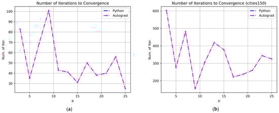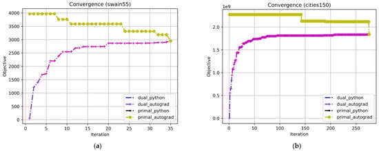 Figure 6 presents the number of iterations it took the algorithm to converge at each  for the two sets of test data. From the Figure 6a, the two versions of Lagrangian algorithms have exactly the same number of iterations at each  for the swain55 dataset. This suggests that the manually computed gradients are exactly the same as the autograd computed values, which verifies the correctness of the autograd-based method again. Figure 6b shows the same result for the cities150 dataset.