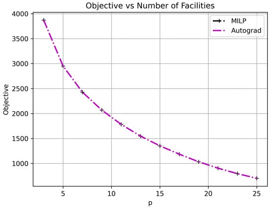 Figure 5 presents the optimal objective values for various values, as reported by the Lagrangian algorithm (autograd version) and the MILP solver, respectively. The value of  ranged from 3 to 25 at a step size of two. First of all, we can observe that the objective curves for the Lagrangian algorithm and the MILP model coincide. This indicates that, for each value of , the Lagrangian algorithm found the correct optimal solution.
